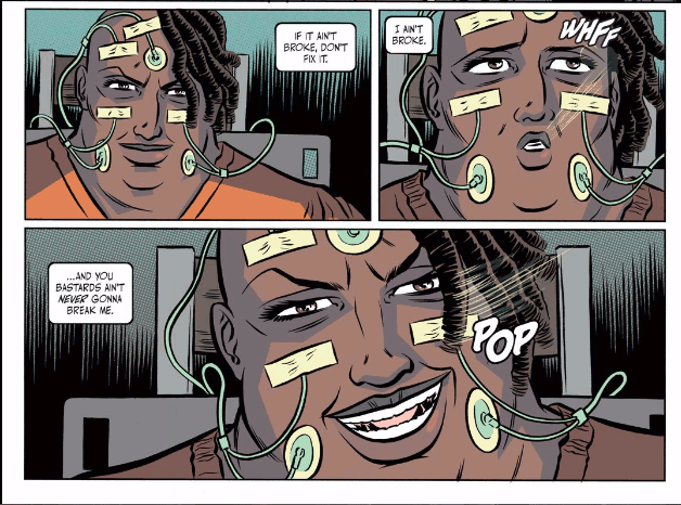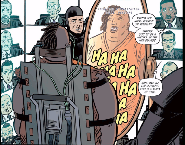 In fact, I would like to talk more about that story, which is in issue 4. The character in question is named Penelope Rolle. She is incarcerated for assault, as well as obesity (and it seems like her weight offends the fathers more than the assault). In this issue, Penelope is hooked up to a machine that’s supposed to show in a mirror what she thinks her ideal self would look like. They flip the switch…