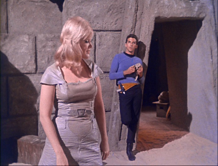 So Kirk, McCoy, and some random science officer named Darnell beam down to the planet. On the way to the Craters’ home, Kirk grabs a handful of grass and jokingly suggests that McCoy see about picking some flowers for Nancy. McCoy hilariously responds, “Is that how you get girls to like you, by bribing them?” See, this is a big part of why I didn’t like “The Cage” all that much. While there was plenty about the pilot that was unintentionally hilarious, the characters didn’t seem to have a sense of humor. I mean, seriously. Look at this smart ass: