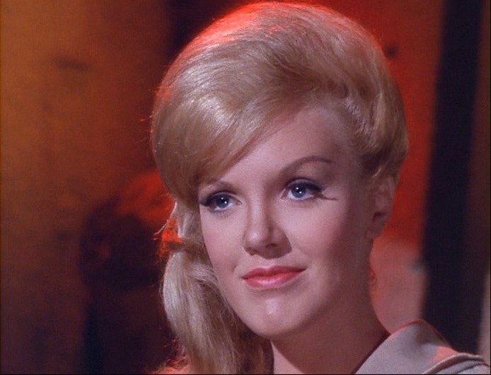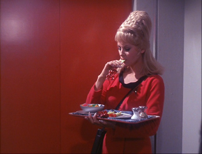 We spend a little time with Greenancy. He spots Yeoman Rand who has a tray with food on it that she’s delivering. Which she rather blatantly takes a bite out of.