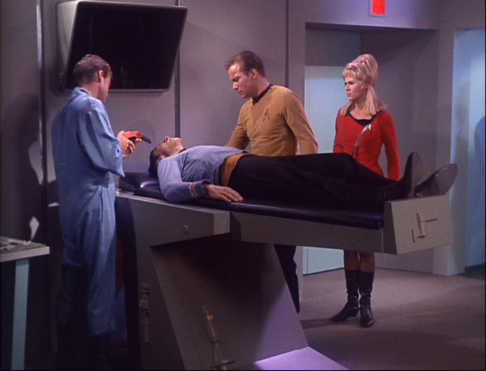McCoy also states that Darnell shouldn’t be dead, since none of his tests picked up that there was anything wrong with him. Other than the whole being dead thing, of course. McCoy sighs as Kirk goes over and pulls the sheet from Darnell’s face, and says that he’ll have the tests double checked, as he may not be seeing clearly. He goes on to say that he could have sworn that Nancy looked the same to him as she did 10 years before when he first saw her, though he “could have been looking at her through a romantic haze.” Kirk is not amused by this digression, and points out that he’s lost a crewmember and he wants to know how. McCoy simply responds “Yes, sir,” and Kirk leaves the room.