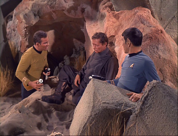 Kirk and Spock take cover while Crater starts ranting about how they want to be left alone and he’ll kill them if they don’t leave. So, I think that pretty much confirms that Crater’s gone around the bend. Spock says that “obviously taking him alive is going to be difficult.” Kirk orders Spock to increase the power on his phaser, while he keeps his on stun. Spock points out that Kirk would be risking his life for Crater’s, and Kirk responds that Crater’s trying to scare them off, “and he’s doing a pretty good job.” I don’t know about that, since Crater with a gun still isn’t that scary. Also, he kind of has that old man “get off my lawn” vibe to him.