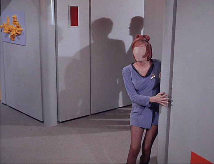 This is interrupted by noises from a nearby console, as Charlie yells at them to stop. Unfortunately for Charlie, his hold over the ship’s been broken, since the helm is responding. Uhura says there’s something off their starboard bow, and she’s received a message that they’re from Thasus. Rand then reappears on the bridge. She starts to ask how she got there, and Kirk reassures her that she’s all right. Spock points out the sensors are picking something up, but it doesn’t seem to be really solid. We then see a kind of weird, impressionist version of what appears to be a ship on the viewscreen.