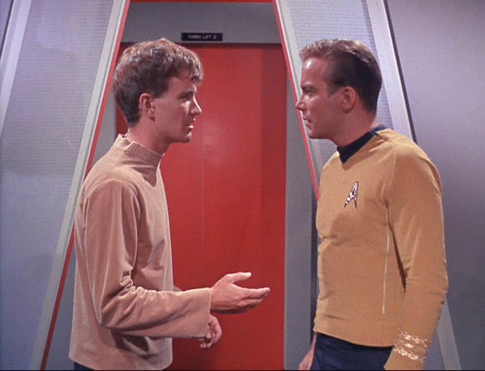 Instead of a horrific beating, Charlie gets a round of applause as the episode cuts to the ship, and then to Kirk talking to a crewman. Apparently Thanksgiving is coming up (apparently they still celebrate that in the 23rd century), and he says that if the crew has to eat synthetic meat loaf, it should at least look like turkey. Charlie then walks in and he awkwardly asks Kirk why he shouldn’t smack women on the behind. Kirk equally awkwardly tries to explain it to him, and fails spectacularly.