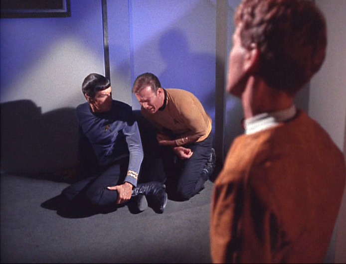 The scene cuts back to the aforementioned quarters. Charlie tells Rand that he loves her, and Rand tells him he doesn’t know what the word means. Charlie grabs her and asks her to show him, and Rand says no. Kirk and Spock rush in, and he knocks them over. Rand responds by slapping him, to which he responds by making her disappear. He asks why she did that (because you grabbed her, numbnuts), and says he loved her, “but she wasn’t nice at all.” He turns to Kirk and says that even though he’s not nice either, he needs Kirk. He says that running the Enterprise is harder than running the Antares, and reiterates that Kirk needs to be nice. He uses his powers, and Kirk doubles over in pain.