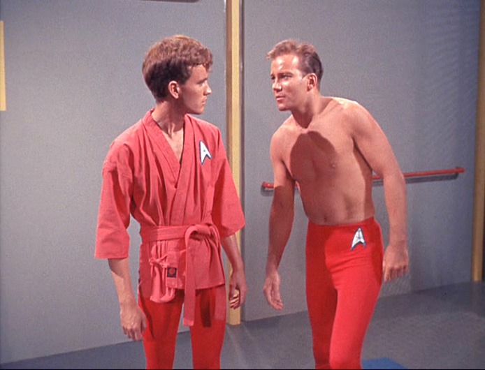 At any rate, Kirk first tries to show Charlie how to fall without hurting himself. Charlie doesn’t really see the point, but Kirk points out that he has to learn how to take a fall before he can show him how to actually fight. Charlie still isn’t too impressed, so Kirk tries a different tack: he calls over a nearby crewmember to show Charlie a throw. He calls Charlie over to try it, and after a scuffle Kirk manages to throw him. Sam (the other crewman) starts laughing. No good can come from this.
