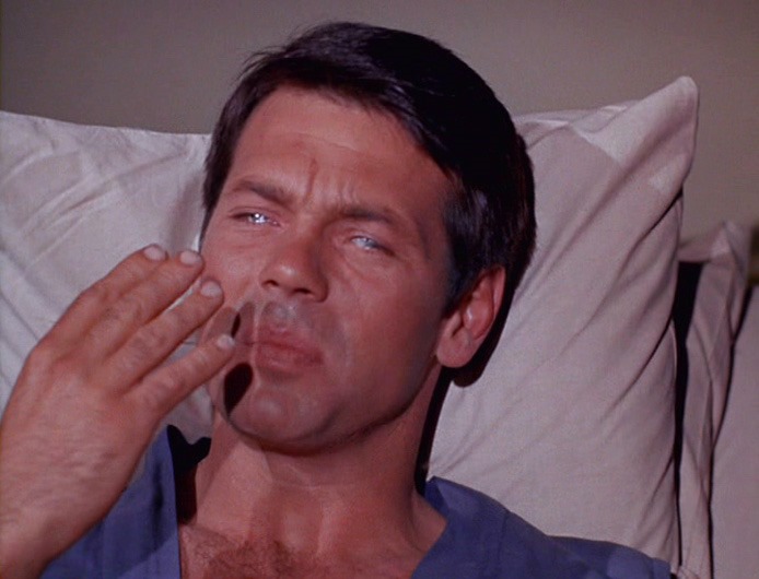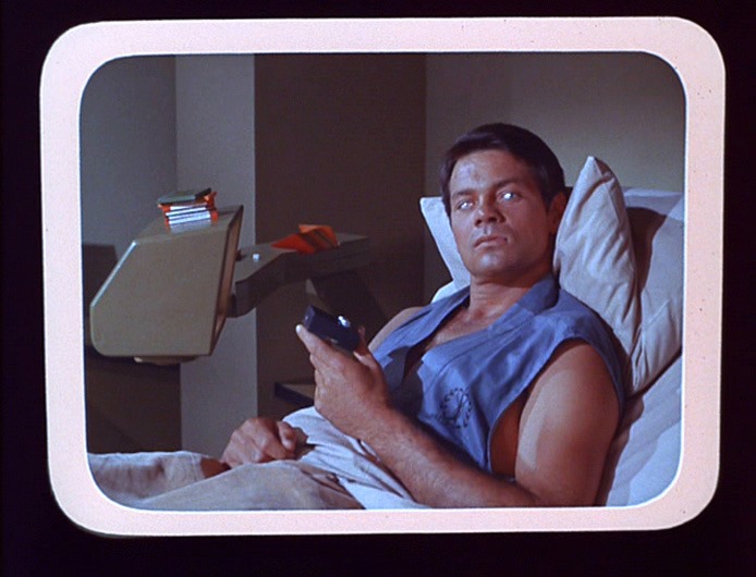 Kirk asks him if he feels different. Mitchell responds that, in a way at least, he feels better than he has in his life. Kirk asks him how, and Mitchell says that, for one, he’s “getting a chance to read some of that longhair stuff you like.” They reminisce about their Acadamy days for a while, with Mitchell jokingly saying that Kirk should be nicer to him. Kirk tells him that Dehner’s going to keep him under observation for a while, and Mitchell seems disappointed. Kirk says he should consider it a challenge, and Mitchell responds, “That doesn’t seem very friendly. Didn’t I say you’d better be good to me?” His voice gets a weird echo in the middle of that statement. Kirk, seemingly a bit freaked out, takes his leave, and Mitchell goes back to reading. Extremely quickly.