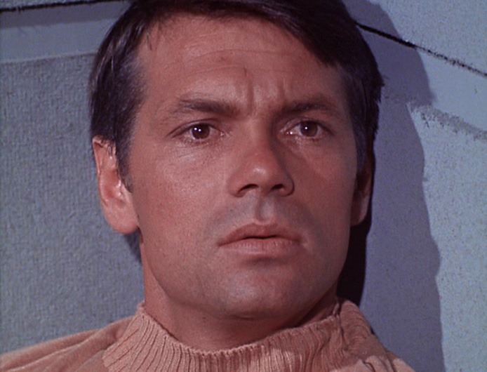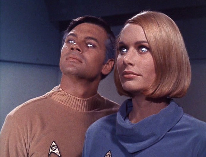 After the break, we see Kirk and Spock going through records of the crew, checking their esper ratings. Dehner comes to the bridge to deliver an autopsy report: the nine dead crewmembers all had a region of their brains burned out. Kirk asks her if she’s all right; she responds that she and Mitchell are fine, except for Mitchell’s fucked up eyes, and that they’re still trying to figure out why the others died. Spock says that they think they’ve already found one, and Kirk elaborates: Dehner, Mitchell, and the nine who died all had high degrees of ESP, with Mitchell’s being the highest. Dehner asks if they think there’s any danger, and Spock points out that the crew of the Valiant didn’t just spontaneously develop an obsession with ESP. The two dicker on this for a little while, until Kirk steps in at this point wondering if there’s really any way to know for sure.