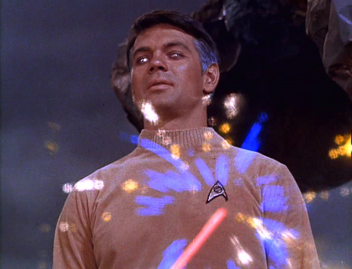 Dehner tells him to stop, and Mitchell starts talking about how he knows what they’re planning nad he can’t let them do it. He has plans, and is waiting until they get to a planet they can use. Dehner asks the obvious question: use for what? Mitchell responds that soon he’ll be able to do anything, at which point Kirk and Spock pin him to the bed and Dehner sedates him.