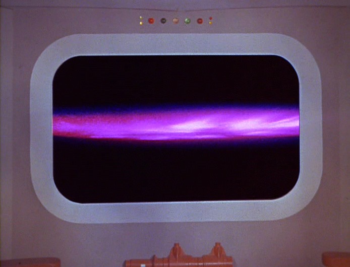 They go forward, until they run into some weird purple space thing (that’s the technical term). Spock says that it’s some kind of force field, and Mitchell states that they’re coming up on it very fast. Spock orders Kelso to turn on the sensors and the deflectors, with odd results: the sensors are saying there’s nothing there, but the deflectors are saying that there is. Kelso points out they’re going to come into contact with it in 12 seconds, and this is when the shit hits the fan.