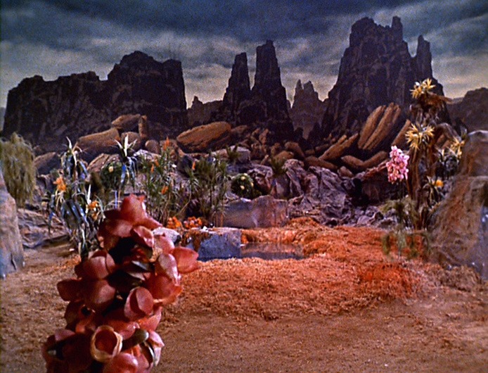 Back with Mitchell and Dehner, the two are walking along the planet’s surface. Dehner says that it would take a miracle to survive on this planet, and Mitchell (with echo-voice) says that he’ll make one. He waves his hand, and the fakest looking oasis I’ve ever seen appears.